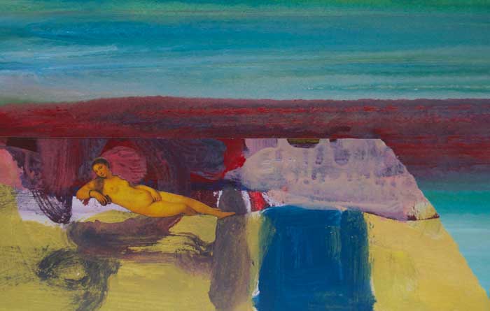 Oil painting with collage. This conjoining of human elements with painting never ceases to intrigue and inspire. Here I chose a classical art historical figure. This piece depicts the languid and sensual feeling associated with spending time on on the rocks at Heysham in Lancashire
