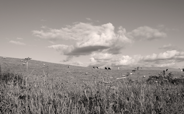 Miniature Friesians Under a Giant Cloud, Milnthorpe, Northwest UK, full frame photograph