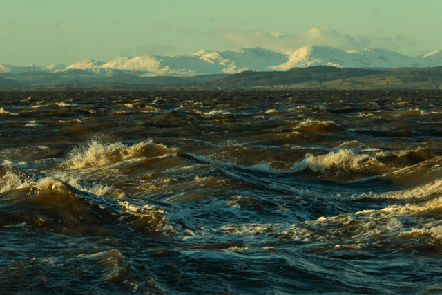 Turbulent white-capped waves offset the snow-silent peaks of The Lakeland Hills across Morecambe Bay