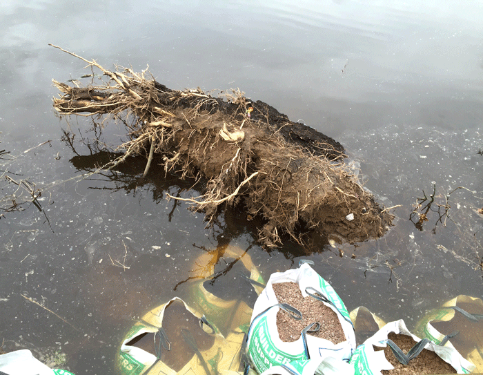 This clump of earth lays amputated a few feet from the riverbank, its network of roots reach helplessly across the water. I saw a connection between the weighted bags of gravel and their spindly, rather useless looking handles.