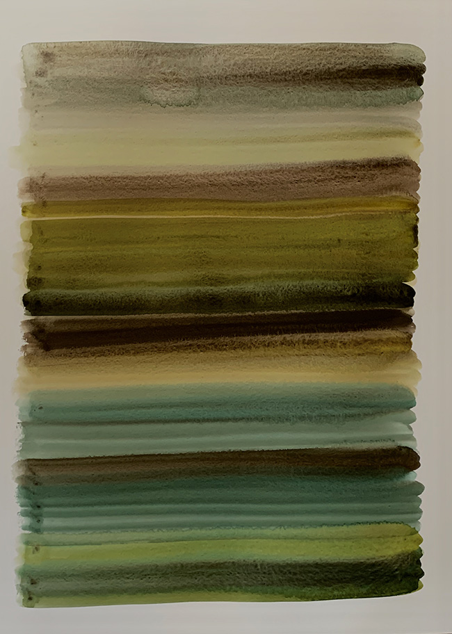 Egg Tempera and pigment on paper 60 x 53cm. Across the bay are shimmering horizontals. Returning to this series as spending more time on the coast