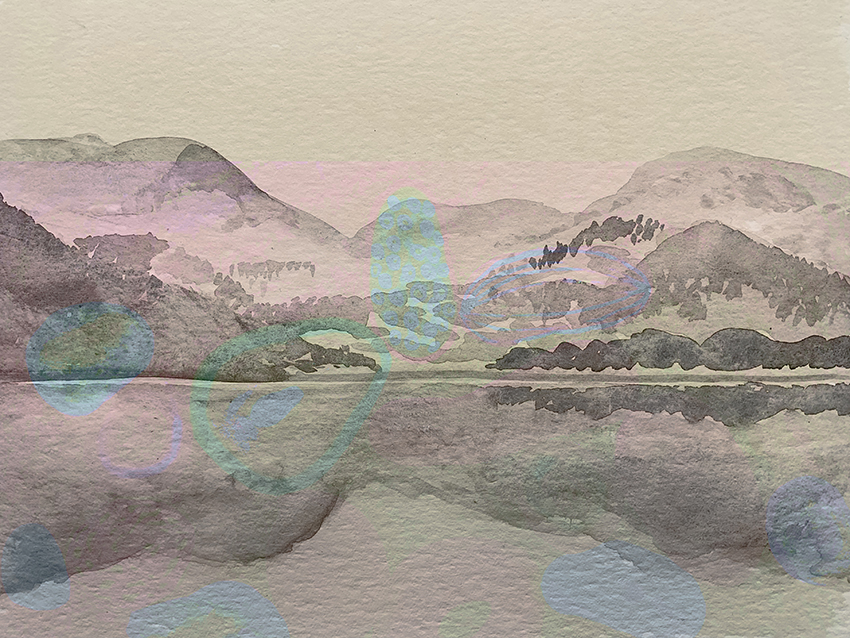 Study of Ullswater in gouache with evolving forms painting digitally overlaid