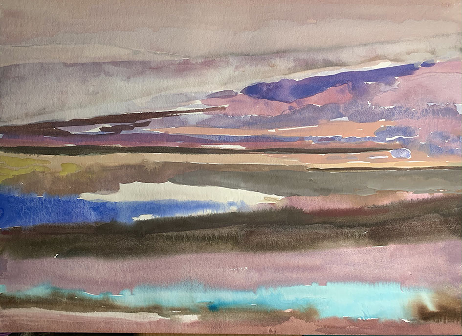 Thinking about colour. At this time of the year, the sky is more pastel-like with purples and pinks more prevalent. Gouache on paper, 30 x 40cm