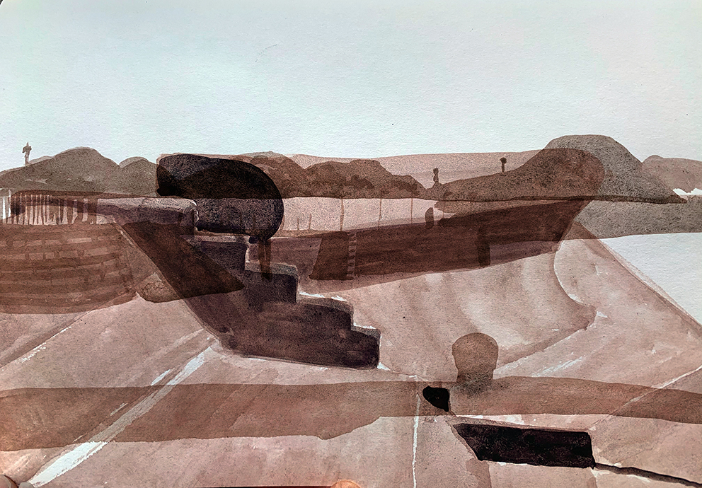 Two drawings of scenes down by the docks overlaid in Photoshop