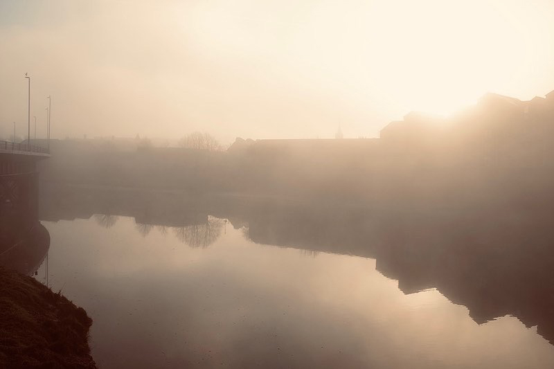 The 18th and 19th of December saw Lancaster shrouded in an exquisite blanket of mist. This photograph was taken with a Fuji X-100T rangefinder camera. A superb camera that has been compared to the very best Lieca's by Ken Rockwell (who is known for his in-depth camera reviews). This shot was taken from the Millennium Bridge towards Sainsbury's supermarket over the river Lune to the left. The beautiful curve is part of the road bridge known locally as The Greyhound Bridge. This bridge was originally built to carry a railway. In 1966 it was converted to carry road traffic and opened for use in 1972.