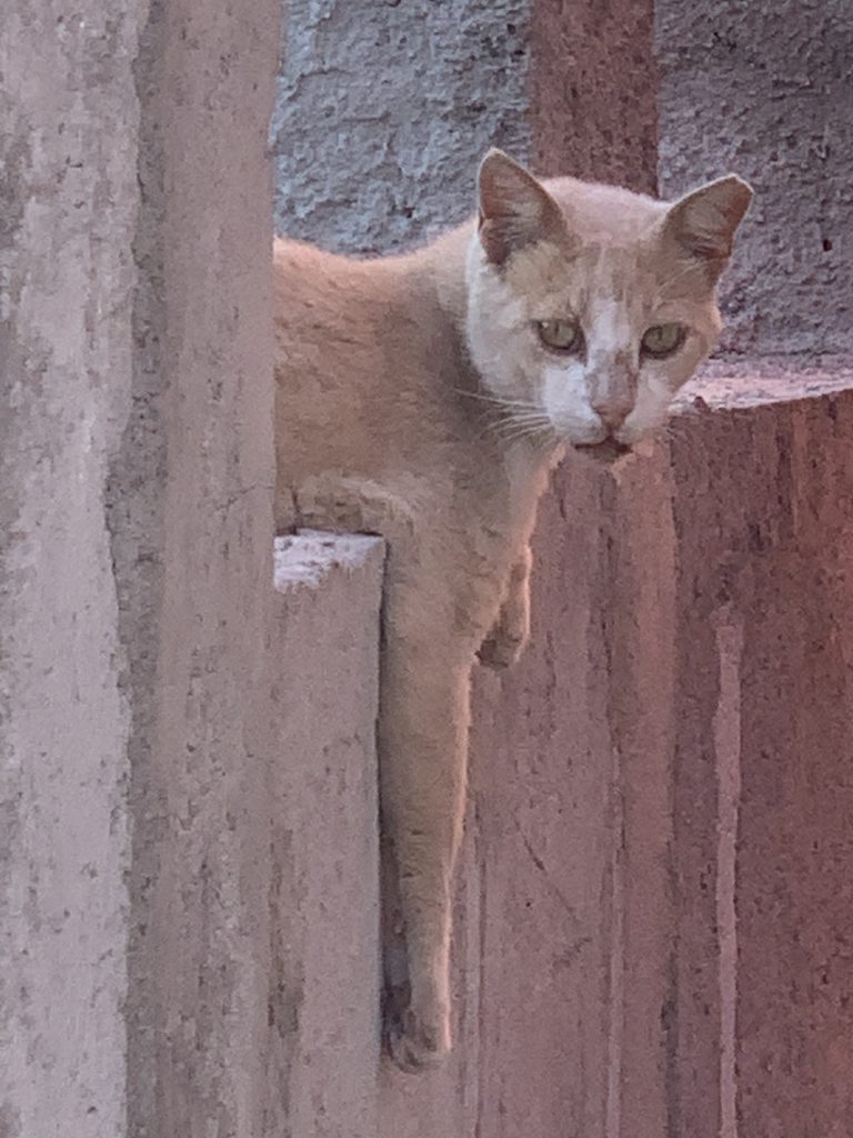 If only I’d had my camera! I couldn’t get close enough with an iPhone but at least there is a shot. You can see on this cat’s face that life on this island isn’t easy. One millimetre forward and this cat might have scarpered. The way his closest legs appears so limp and weightless, works well against the line of that hard wall, while the tonality seems to have both components melting into one another. The sorrowful, mistrustful expression, the soft palette and the sadness, melted my heart