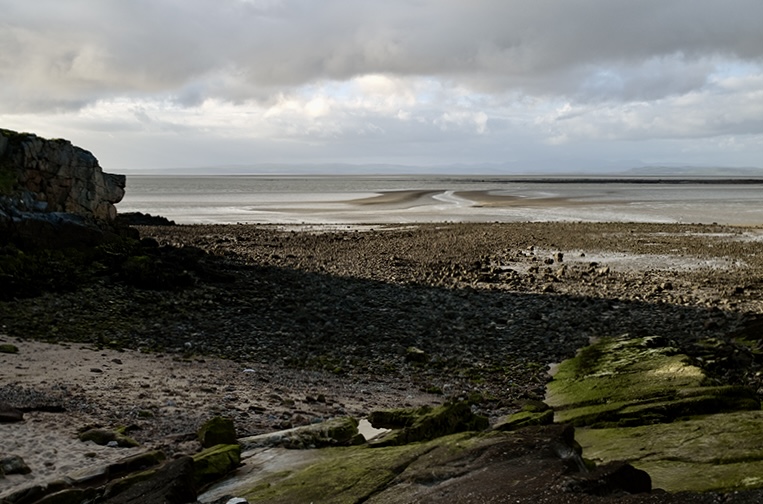 There is no light without shadow. The message came through loud and clear on the shore today. I love how this space is divided up. The long black diagonal, the green algae covered rocks on the right and then in the distance almost a soft beige runway leading to the horizon. Further still, the soft blue, white and grey of cloud layers. Although the light is here in the hard foreground, far away there is a softer light that appears tantalising and unreachable.