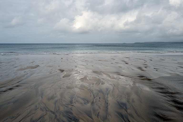 Sand, sea and sky at Carbis Bay, Cornwall. The sea colour is so different to Morecambe Bay. More aqua. This raises many questions, the first being 'why?' The second question is where does the Atlantic end and the Irish Sea begin. The divisions are merely unnatural ownership names given by humans. It's the same sea. It's the same sea no matter where in the world you are. I took this photograph for the beautiful patterns created on the sand as fresh water ran from the high cliff into the sea. I'm imagining the dark brown colour is actually mud washed down from the cliff which is dense with vegetation. The wonder is that It turned the beach into filigree. The word comes from Latin - filum/thread and granum/grain. Most apt for these natural shifting patterns. So wondrous was it, I could have stood there for hours.