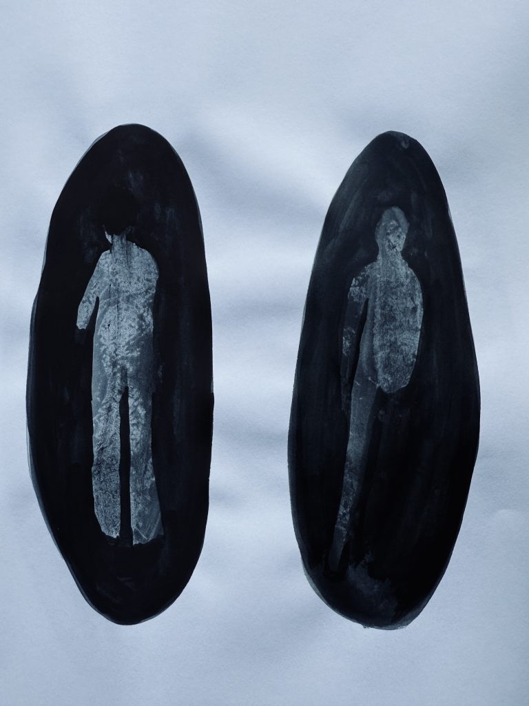 These encapsulated figures are 16cm. They are made quickly with a brush and egg tempera paint which I make myself from a pigment called spinel black. A particular favourite. This was until recently, the blackest black you could buy. Spinel black pigment comes from the black spinel gemstone, sometimes known as black diamond. It's such a rich pigment to work with and seems to possess a life of its own